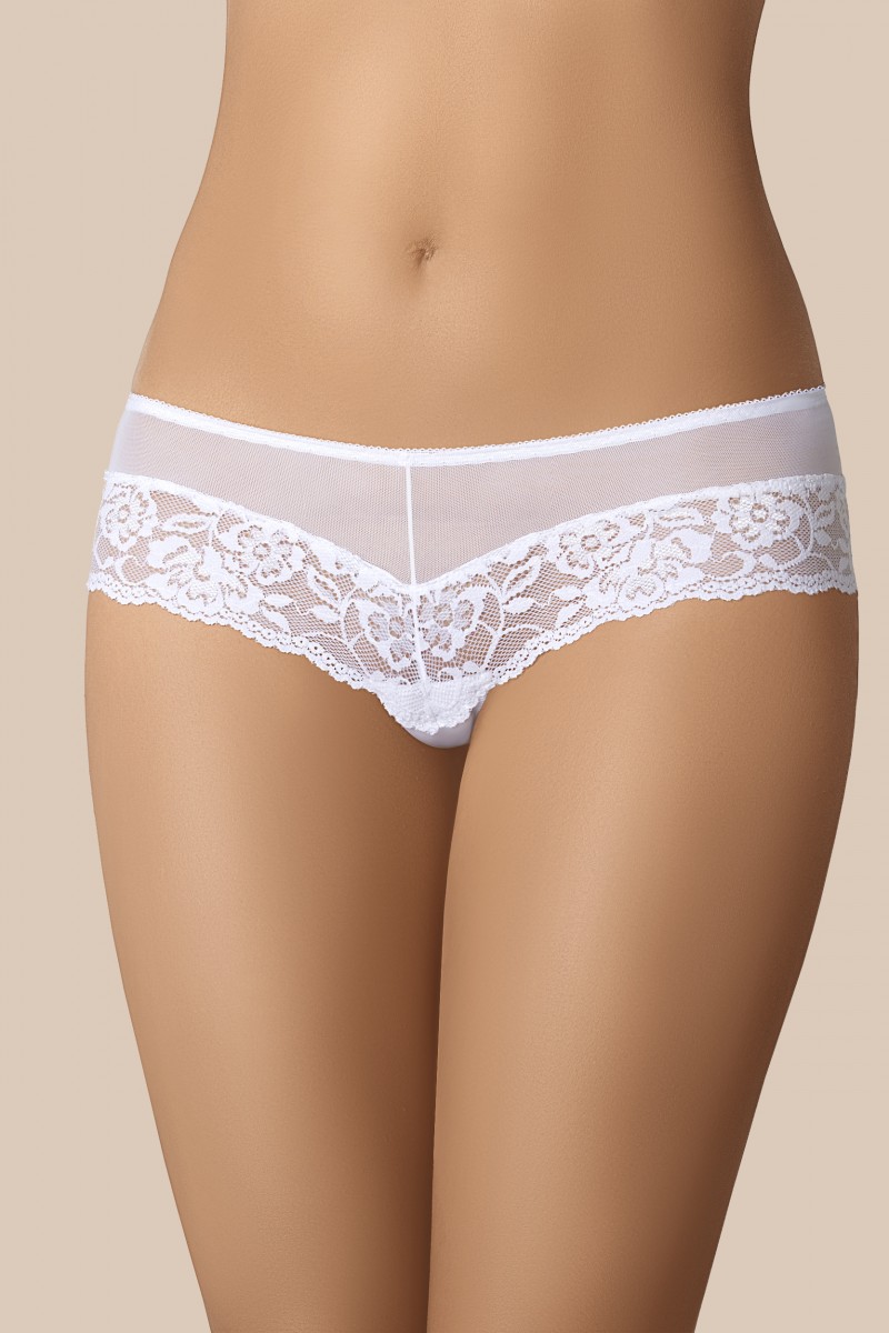 Трусы женские из эластичного трикотажного полотна. Низкая линия талии. Трусы состоят из кокетки и нижней части и ластовицы без боковых швов, с центральными швами. Кокетка из эластичного трикотажного полотна. Нижняя часть из эластичного кружева.