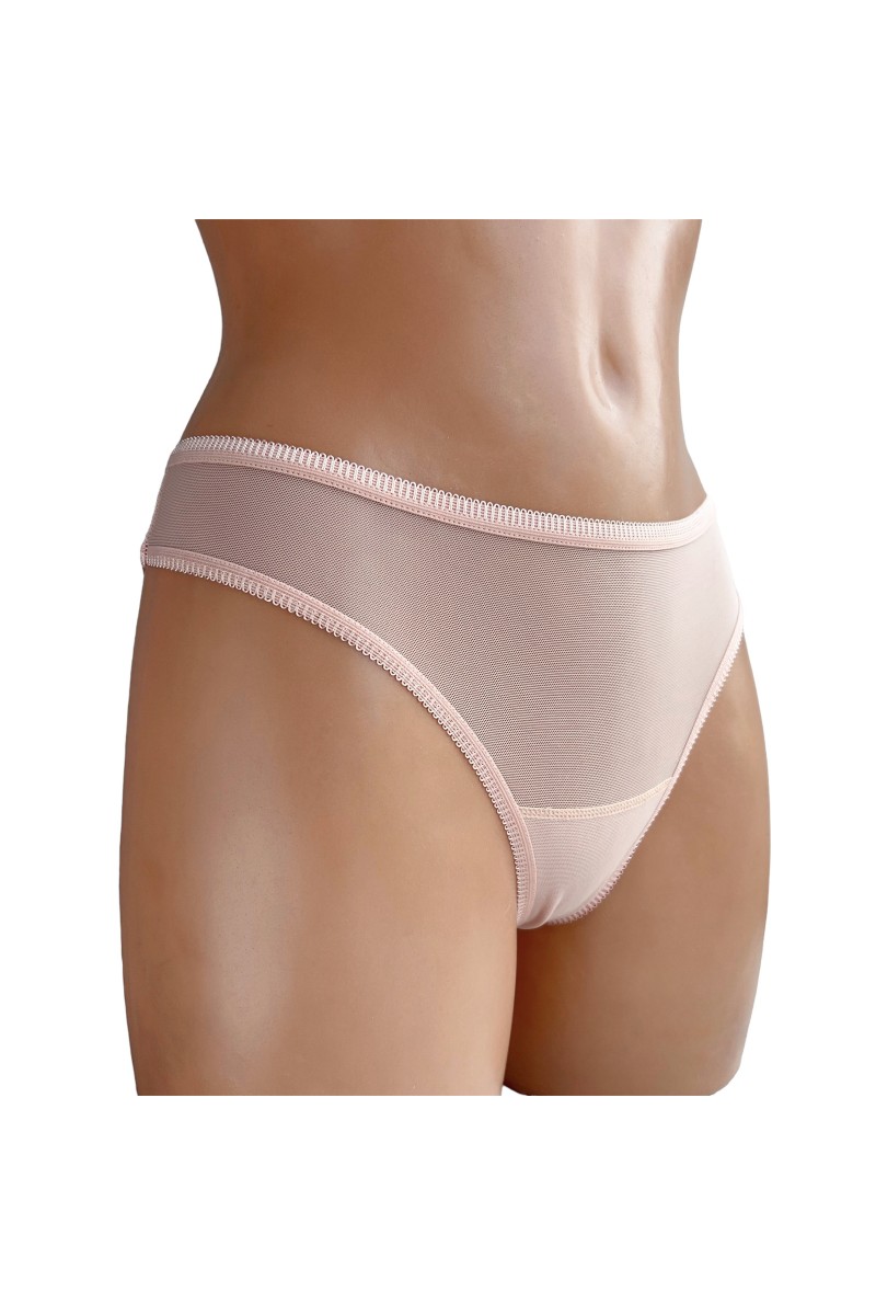 Трусы – стринги с заниженной линией талии. Выполнены из полотна трикотажного сетчатого полотна. Подкладка ластовицы – из 100% х/б. Задняя деталь декорирована кружевными отделочными деталями и атласным бантиком.
