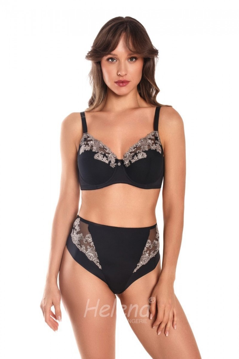 Бюстгальтер тройного диагонального членения, нижние детали чашек на дубляже с хлопком, на каркасах. Бюстгальтер выполнен из эластичного кружева и эластичного трикотажного полотна.Трусики слип высокая талия.