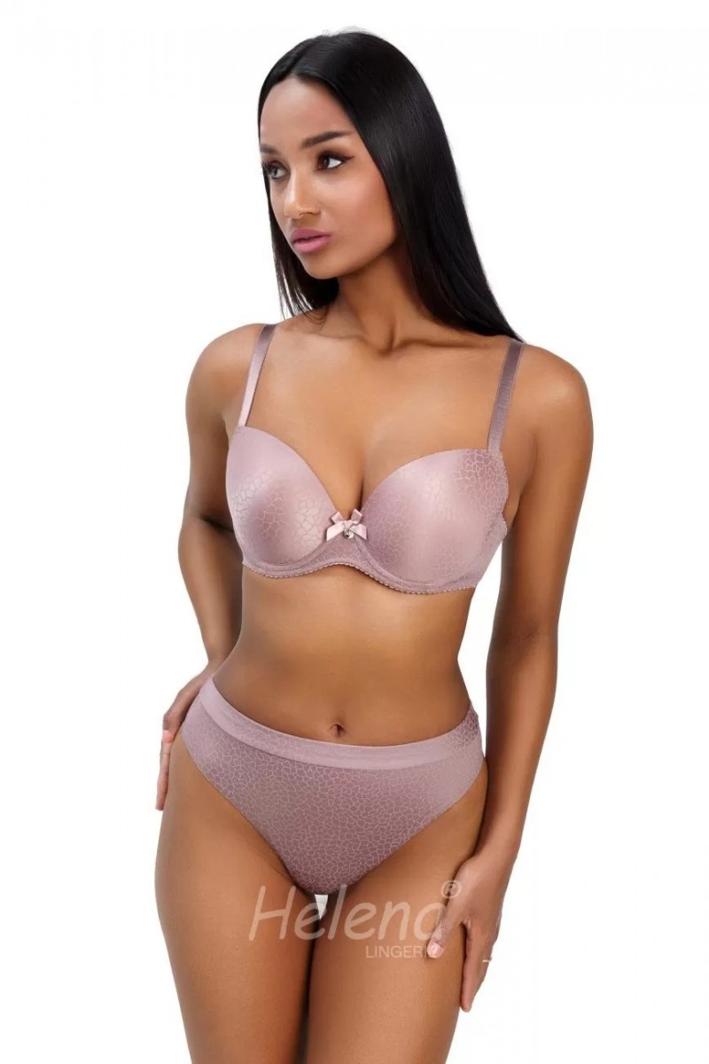 Бюстгальтер выполнен из эластичного трикотажного набивного полотна на каркасах с жесткими формованными чашками.Эта модель бюстгальтера обеспечивает идеальную посадку, придает округлую форму, формирует глубокую линию декольте. Трусы женские «слипы» с средней линией талии на притачном поясе.