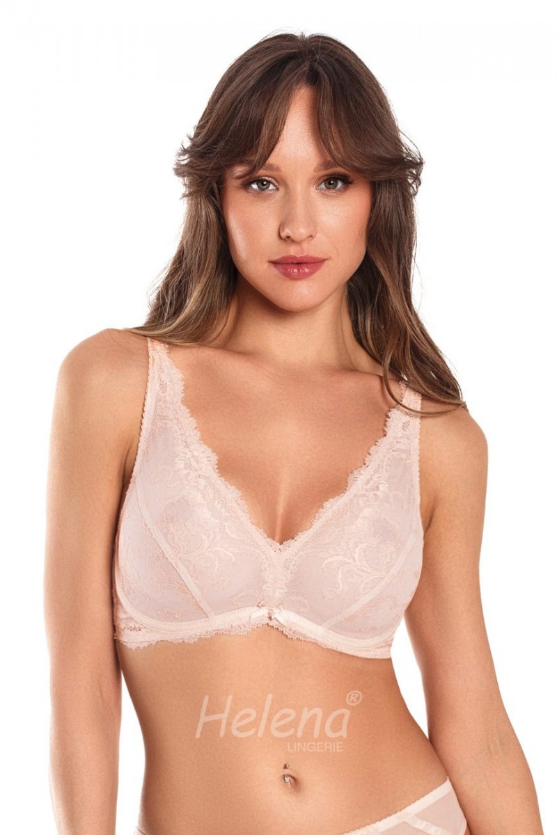 Бюстгальтер модель с мягкими чашками на стане, на каркасах. Чашки бюстгальтера из кружева и имеют двойное диагональное членение. Боковая деталь стана из эластичного кружева. Бретель несъемная, регулируемая. Модель бюстгальтера подчеркивает естественную форму и обеспечивает надежную фиксацию женской груди.